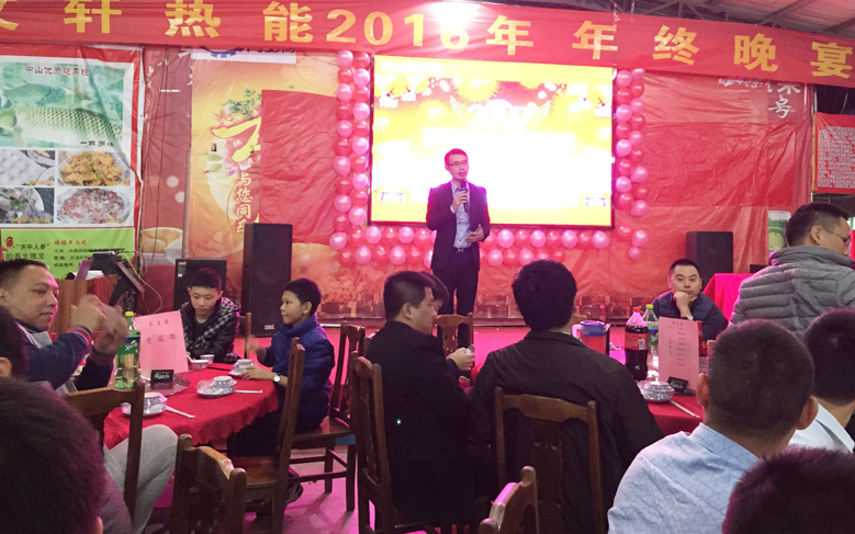 晚宴由主持人宣布開始,并由主持人為文軒熱能對2016年作簡單的總結,接下來是由總經理周吉勇先生發言,周總的發言主要是對2017年提出了要求和期望。為提升文軒的公司文化,周總還提出了要讓“以客戶為中心,以員工為根本,以持續創新為主導”成為今后公司發展的企業文化,得到了全體員工的熱烈歡呼、積極響應。
